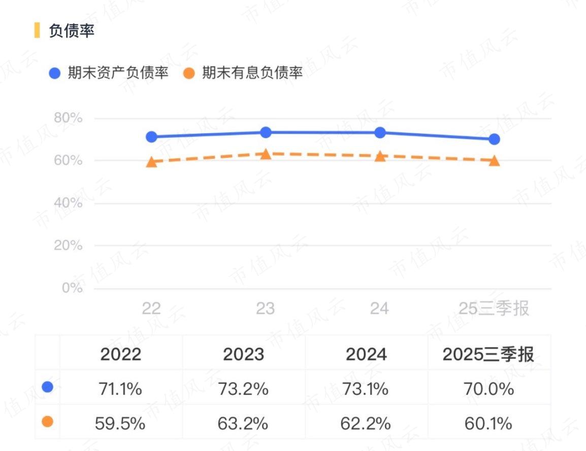 但風(fēng)險(xiǎn)也同樣實(shí)在。高杠桿運(yùn)營是其一,截至2025年第三季度末,公司的資產(chǎn)負(fù)債率仍在70%,有息負(fù)債率高達(dá)60%。